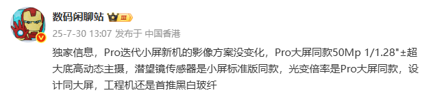 据爆料,小米16 Pro的影像方案没有变化,搭载小米16 Pro Max同款的5000万像素+1/1.28英寸超大底高动态主摄,同时配备一颗潜望式长焦镜头,传感器为小米16同款,但是光学变焦倍率与小米16 Pro Max保持一致,工程机首推黑白玻纤版本。