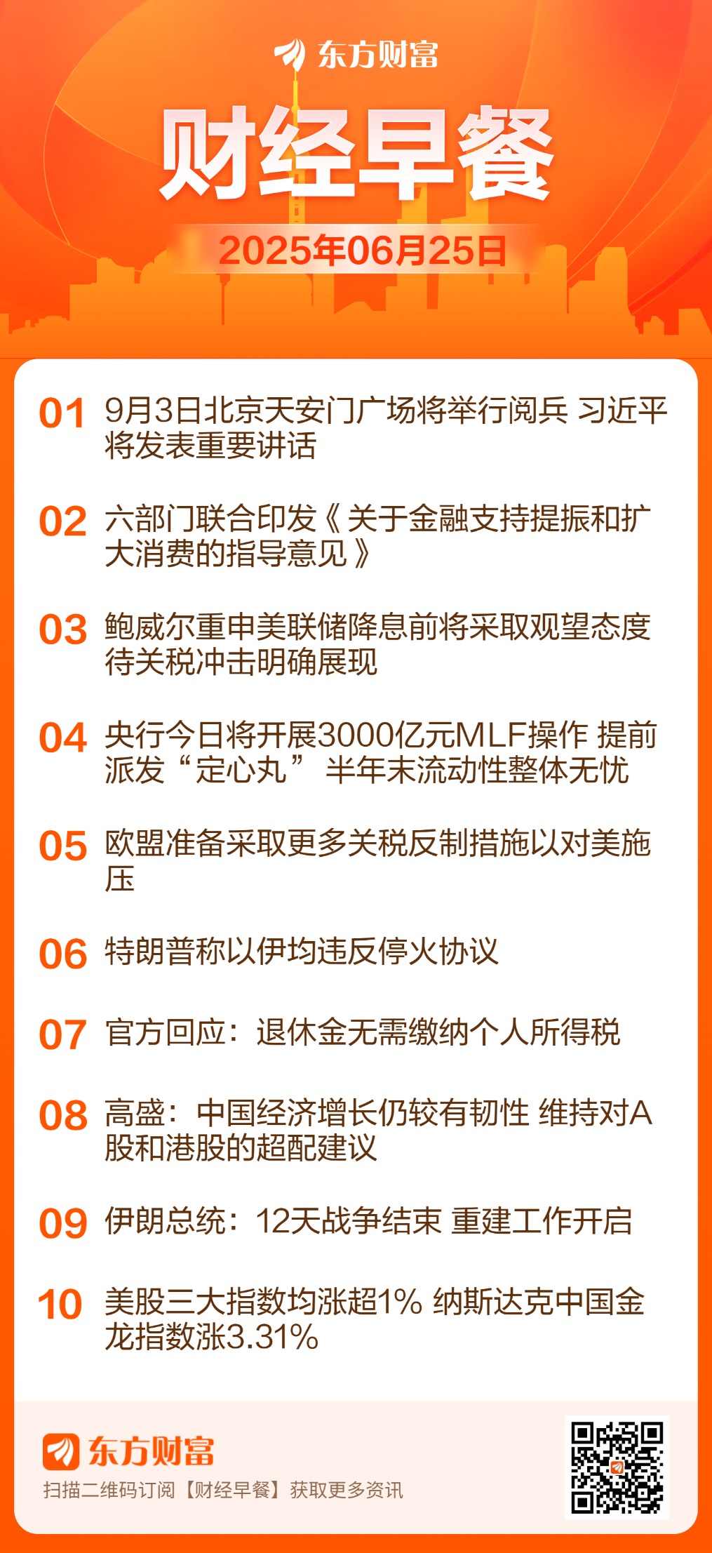 澎湃新闻:中国人民银行发布2025年6月中期借贷便利招标公告称,为保持银行体系流动性充裕,2025年6月25日(周三),中国人民银行将以固定数量、利率招标、多重价位中标方式开展3000亿元MLF操作,期限为1年期。鉴于6月有1820亿元1年期MLF到期,央行自3月起将连续4个月超额续作MLF。